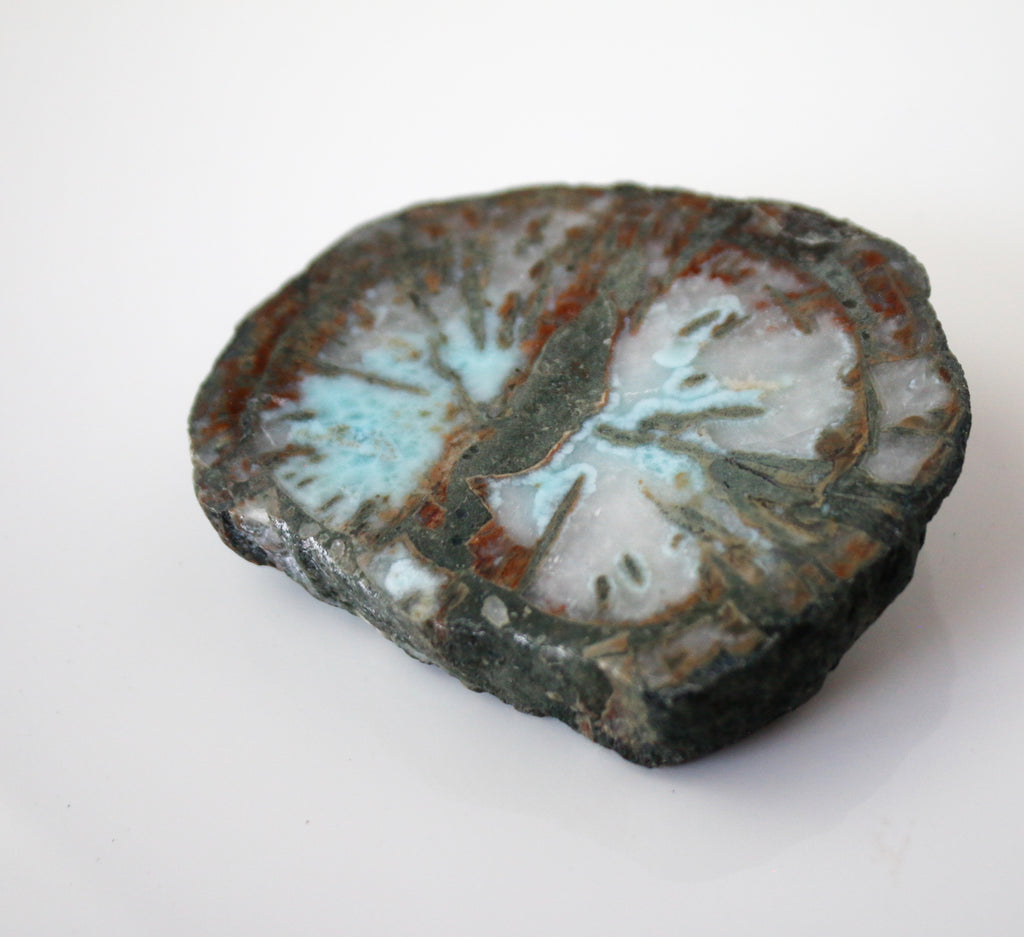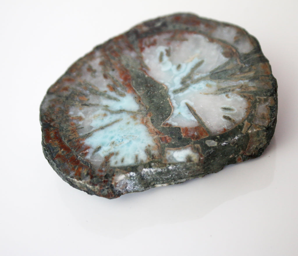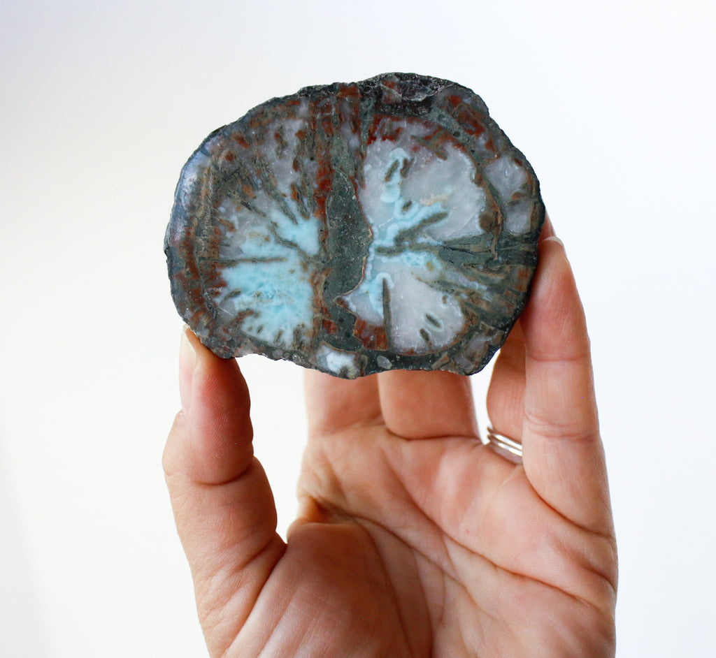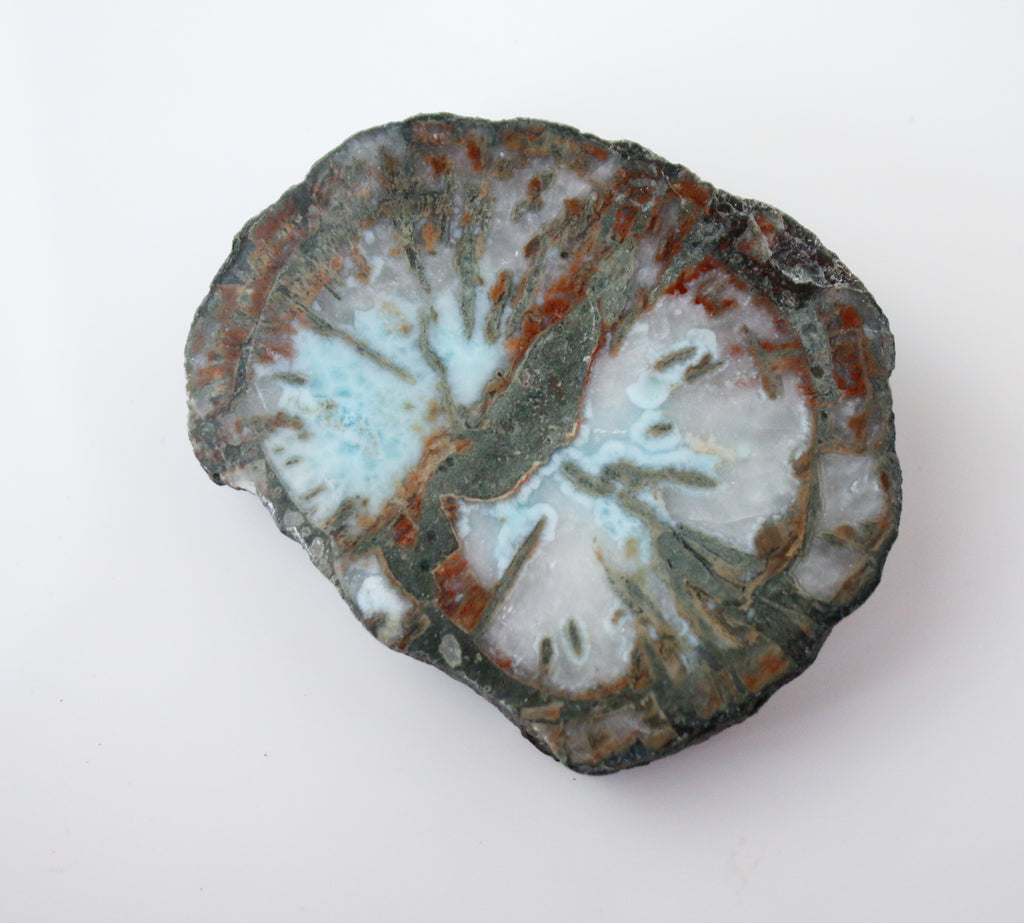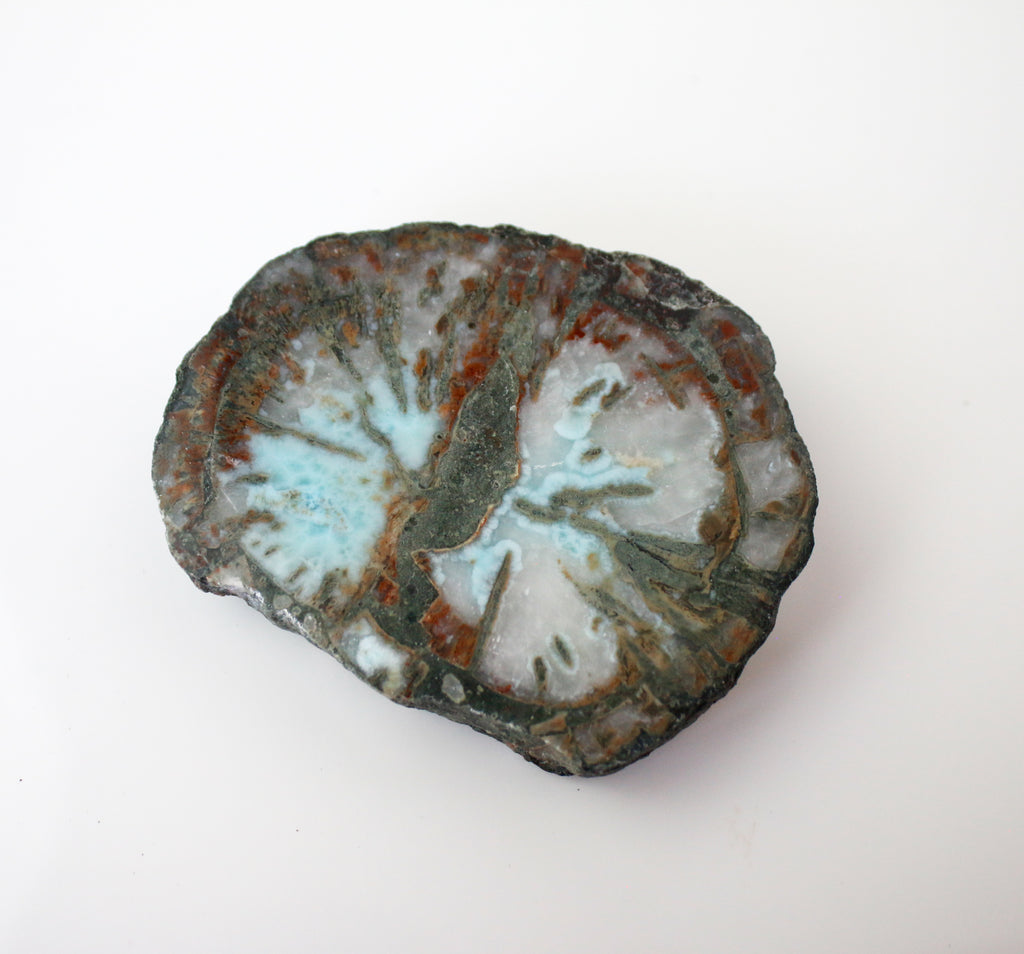 So many types of silicates can replace wood, but this is something that is so rarely seen. These rare logs and pieces of the larimar wood have been saved for a long time and were sliced and polished recently. So exciting, right? Now we have these works of art from nature. Enjoy!